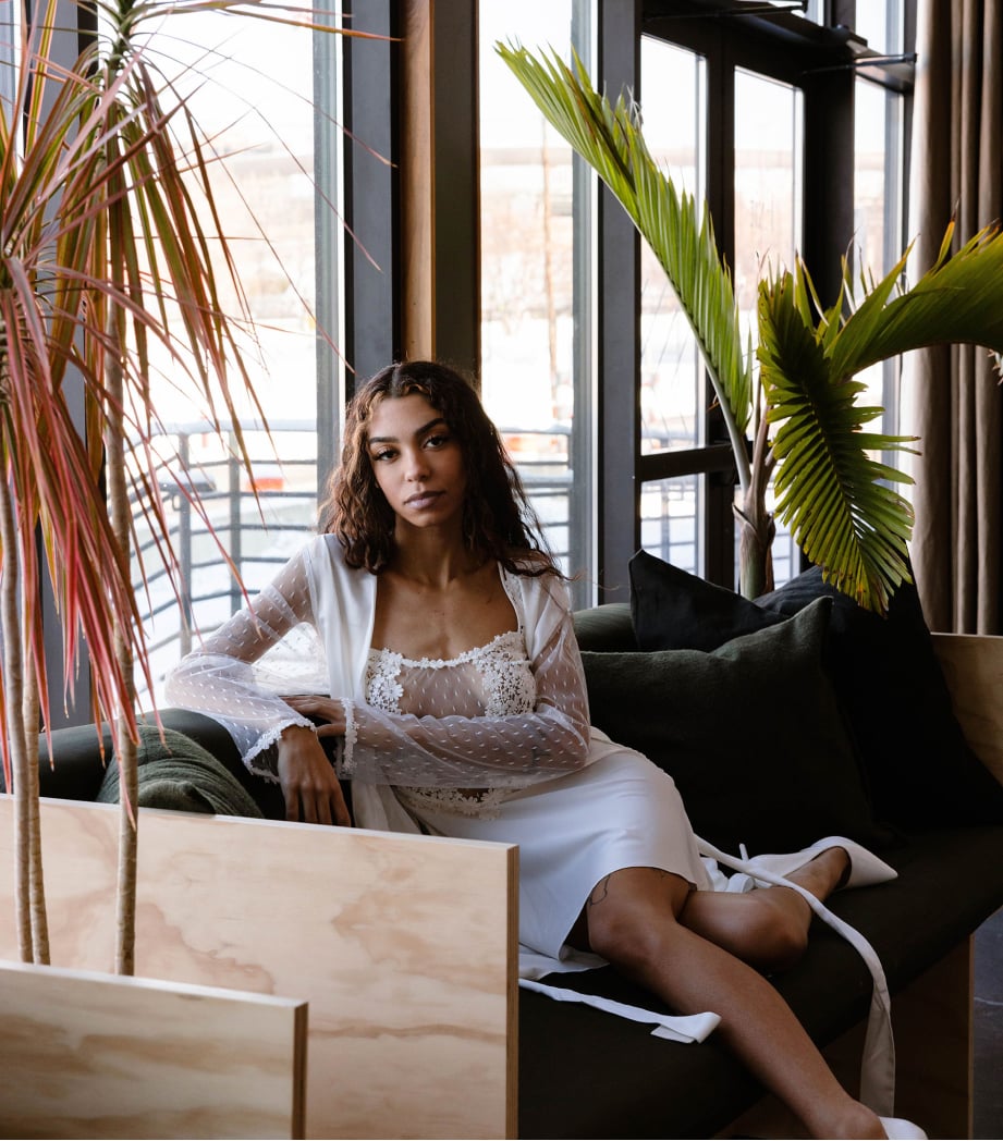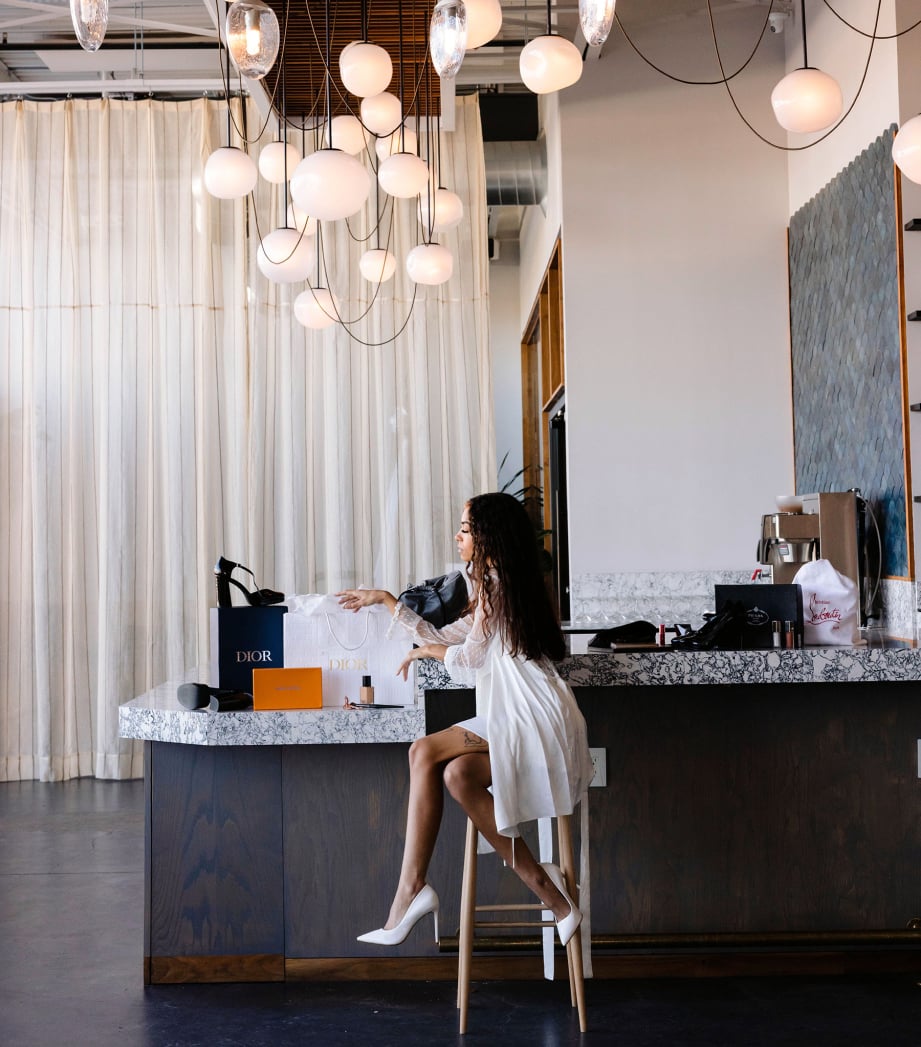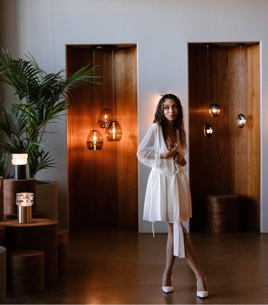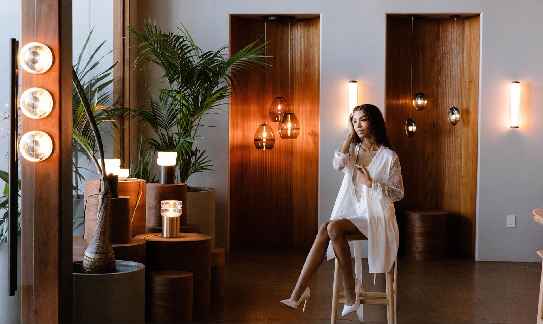 Shot by Irelynd Williams of HER.co, the model is featured lounging in the loungiest lounge underneath the Hennepin Made lights before the big ceremony.