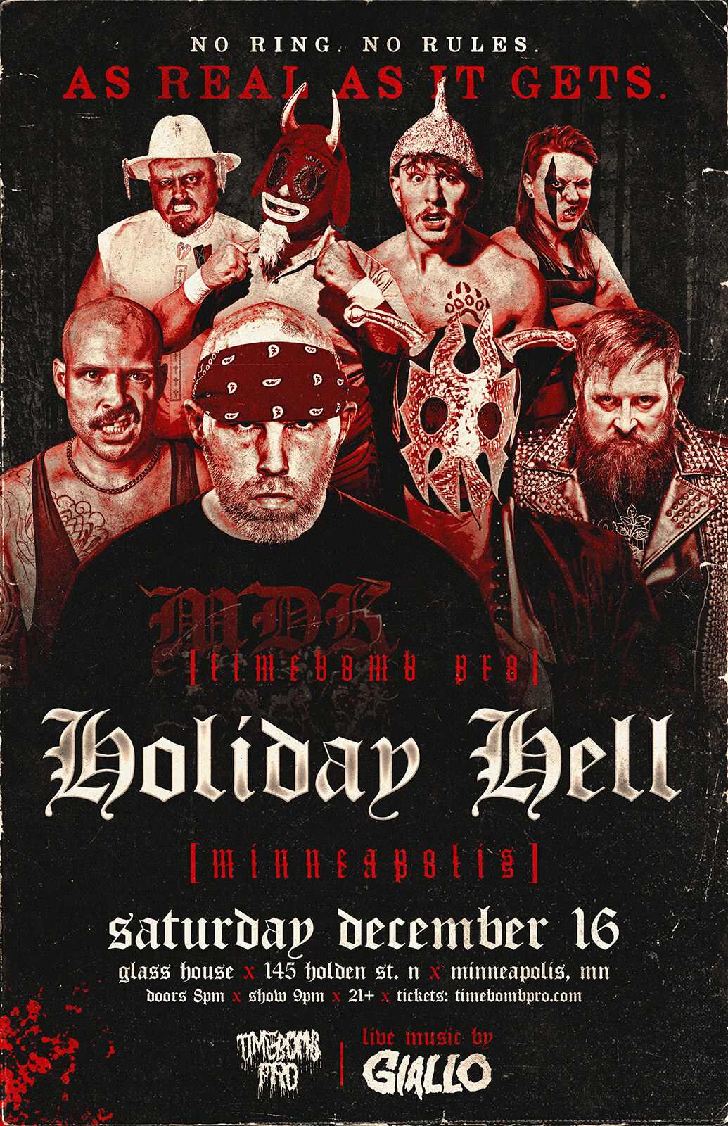 Timebomb Pro Wrestling returns to Minneapolis for Holiday Hell! It’s No Ring No Rules action featuring NICK GAGE, Arik Cannon, Badger Briggs, Jordan and ULTRAMANTIS BLACK? Plus live music from GIALLO!